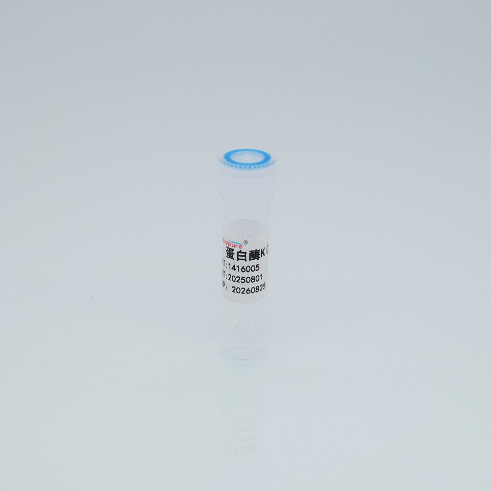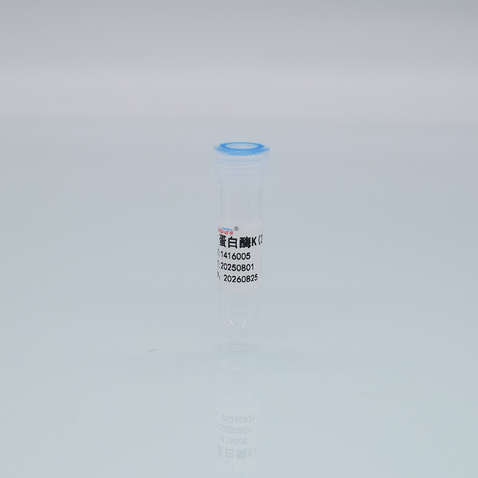 蛋白酶K(Proteinase K),相对分子量约为29.3 kDa, 是一种切割活性较广的丝氨酸蛋白酶。可切割脂族氨基酸和芳香族氨基酸的羧基端肽键,应用广泛,可用于制备脉冲电泳的染色体DNA,蛋白质印迹以及去除DNA和RNA制备中的核酸酶等实验,蛋白酶K的一般工作浓度是50—100µg /ml。因蛋白酶K在变性剂如SDS(1%)中可提高其活性,所以在使用中,常根据所用缓冲液是否含有SDS、尿素、pH、温度等因素确定具体的工作浓度。蛋白酶K在较广的pH范围内(pH 4-12.5)均有活性。